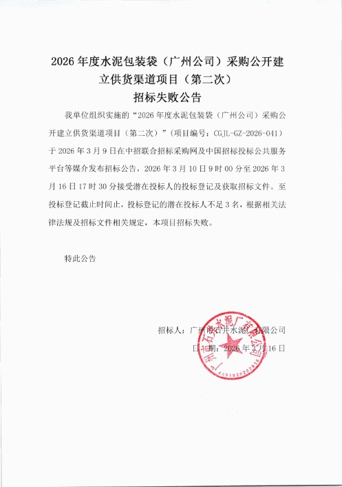 2026年度水泥包装袋(广州公司)(第二次)招标失败公告